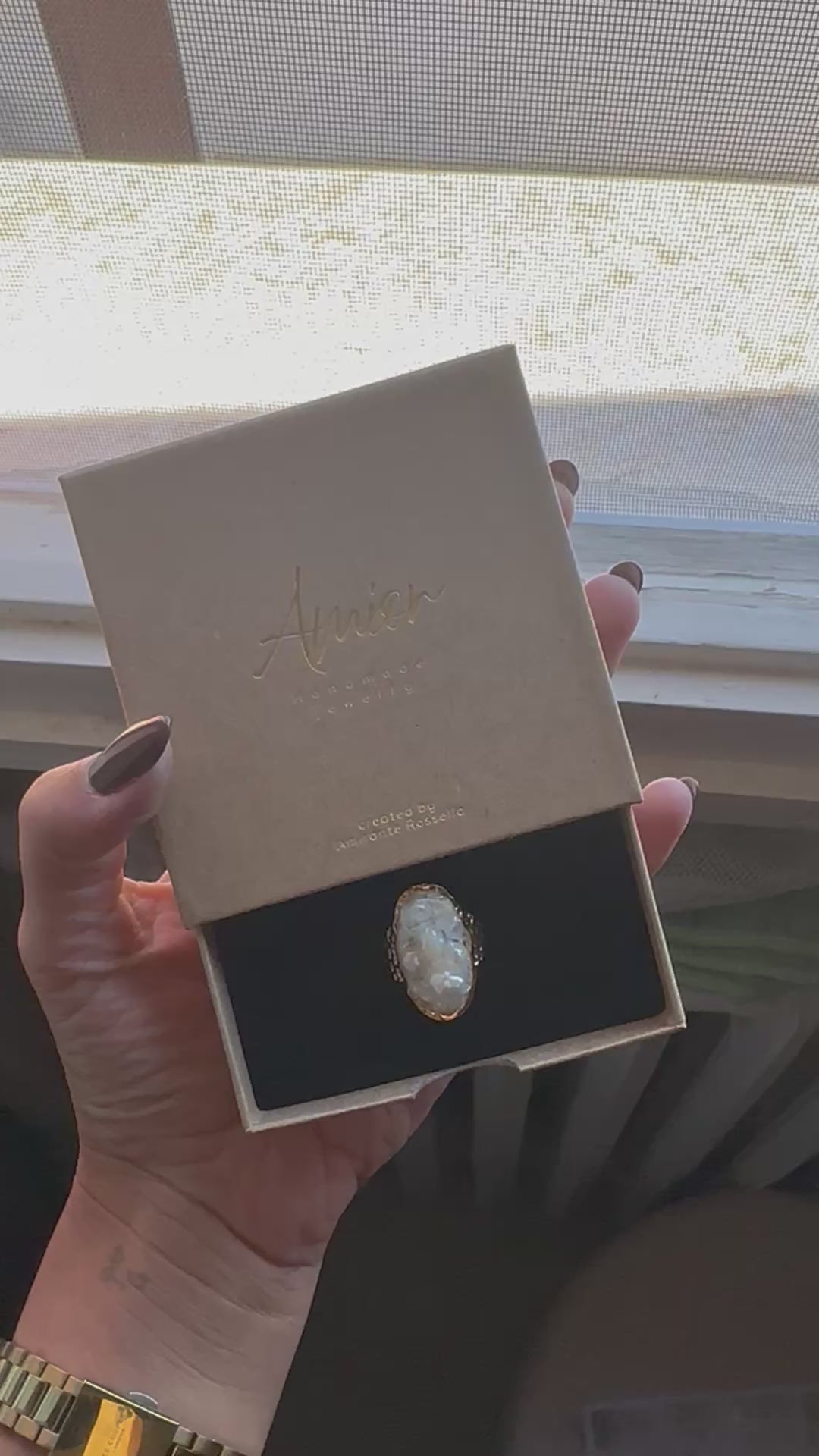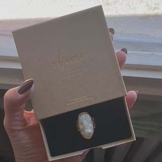 Anello Lacrime di perle regolabile,composto da pezzi di perle incastonati uno ad uno. La luce che da indosso questo anello lo rende spettacolare.