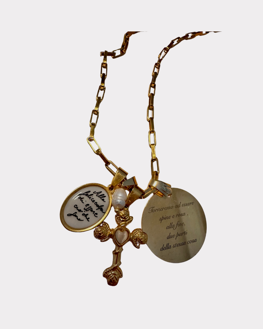 Il ciondolo Croce di rose rappresenta una croce le cui estremità richiamano una rosa, al centro un cuore.Simboleggia la fede e l’ amore che impieghiamo nella vita per diventare ciò che siamo, per amare ciò che amiamo.