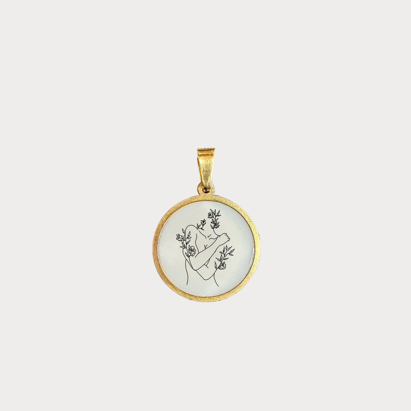 Ciondolo I love me in acciaio inossidabile placcato oro di dimensione 20*30 mm, raffigura una donna fiorita che si abbraccia.