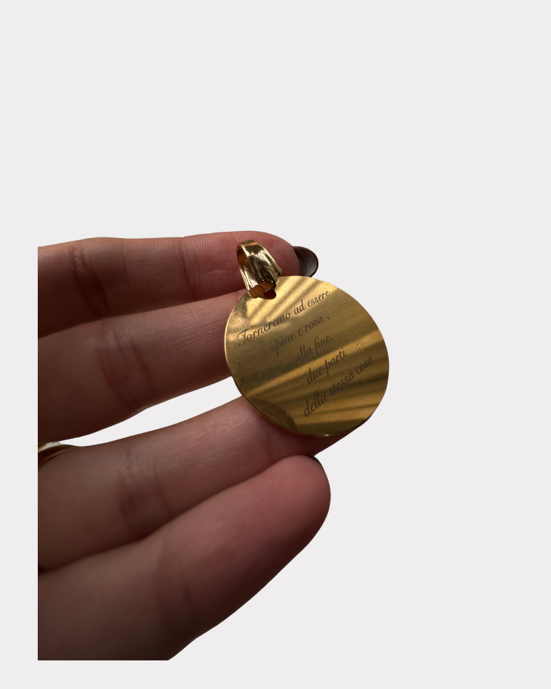 Il ciondolo Spine e rosa recita incisa a laser la frase: Torneremo ad essere spine e rosa, alla fine, due parti della stessa cosa.