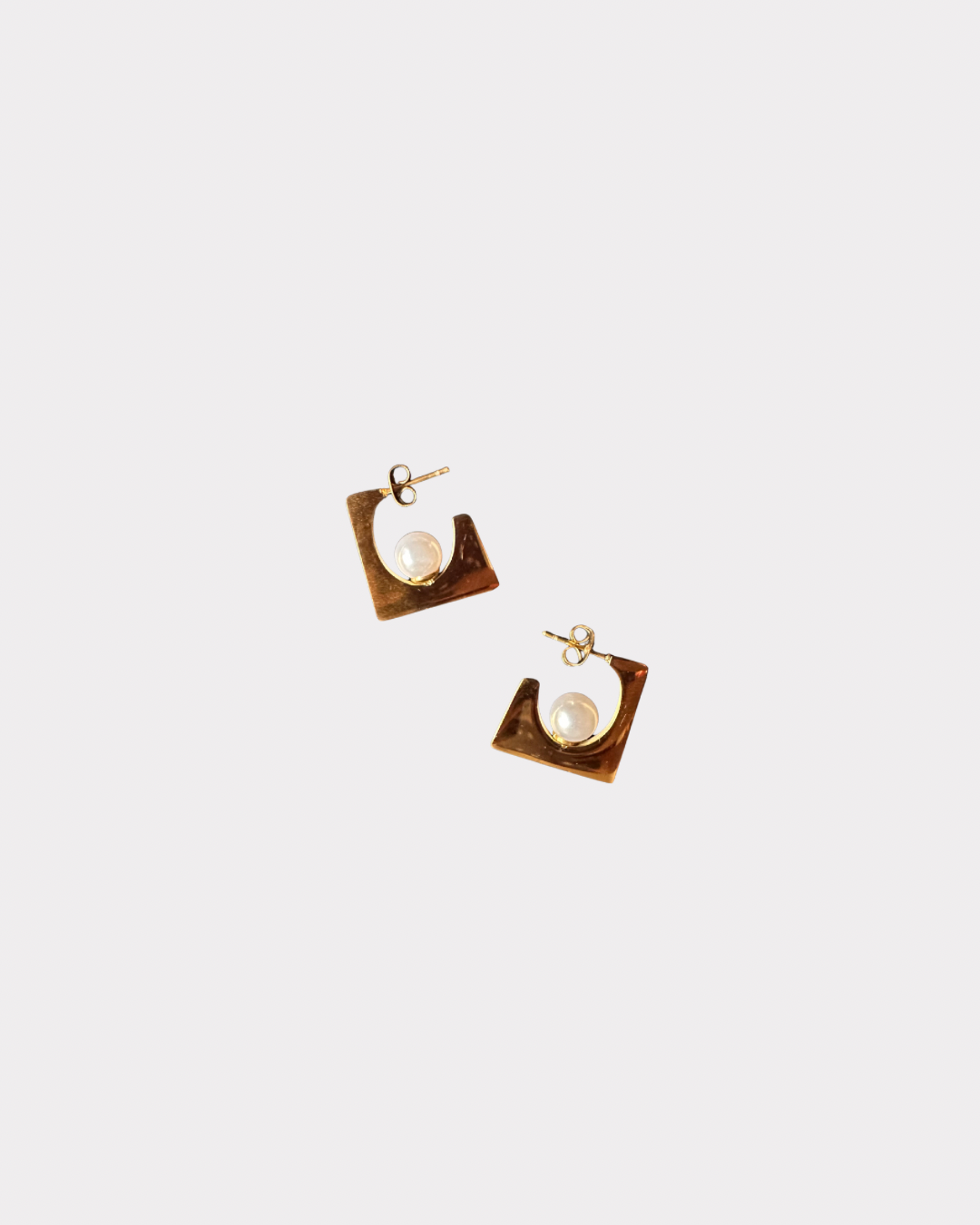 Coppia di orecchini a bottone dorati in acciaio inossidabile di forma squadrata con perla incastonata.
