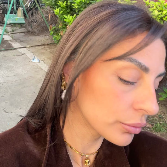 Set composto da un paio di orecchini a bottone dorati in acciaio inossidabile placcato oro con perla di fiume big e da un earcuff in acciaio inox placcato oro con perla di fiume mini
