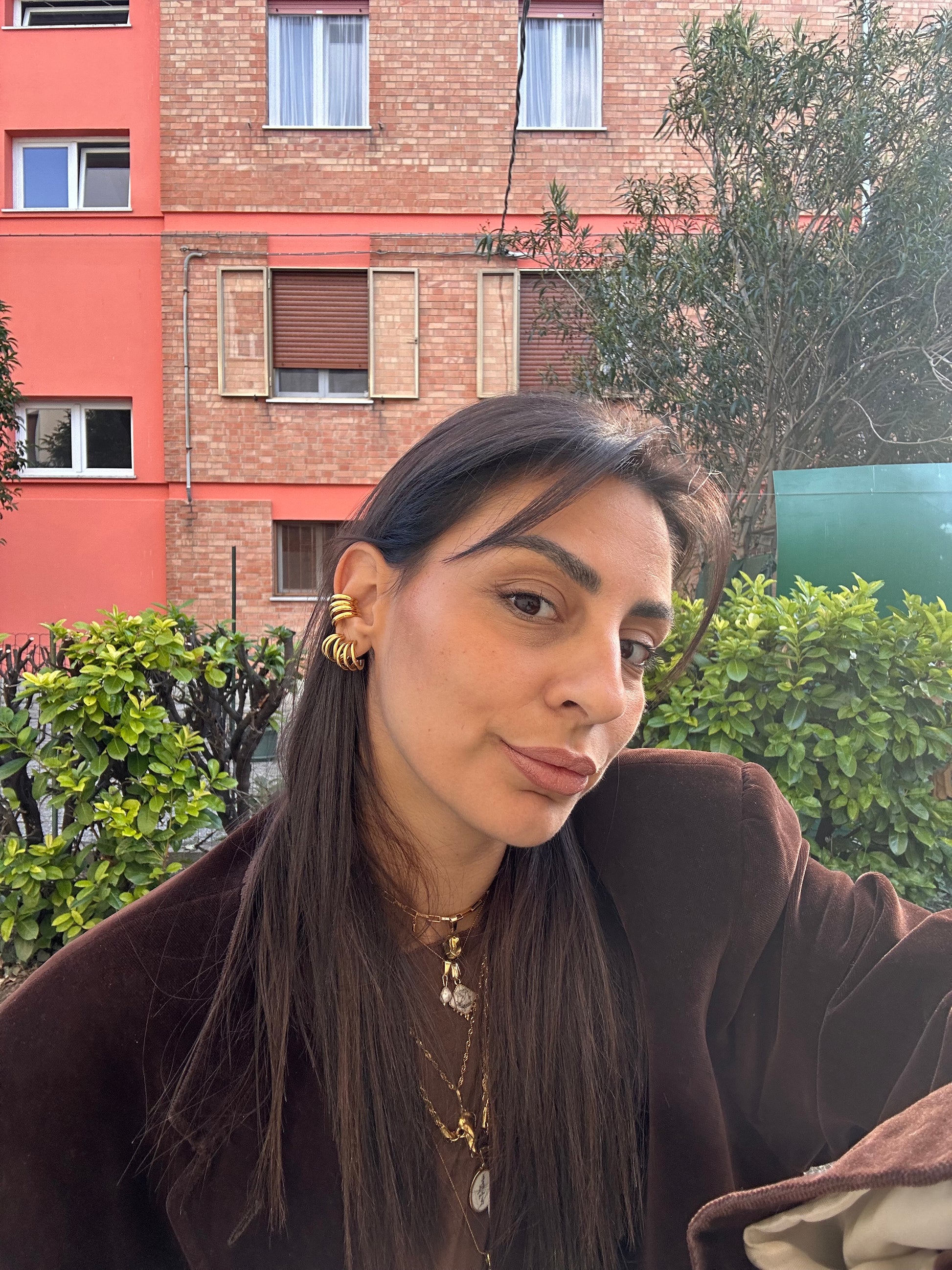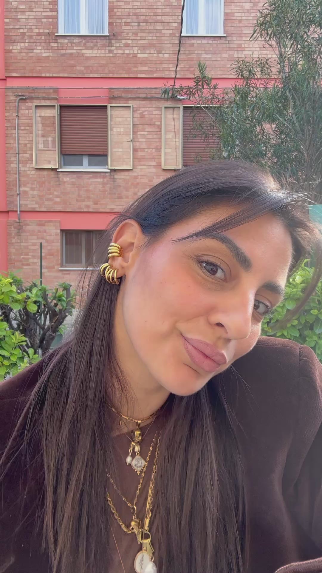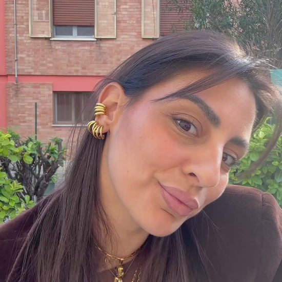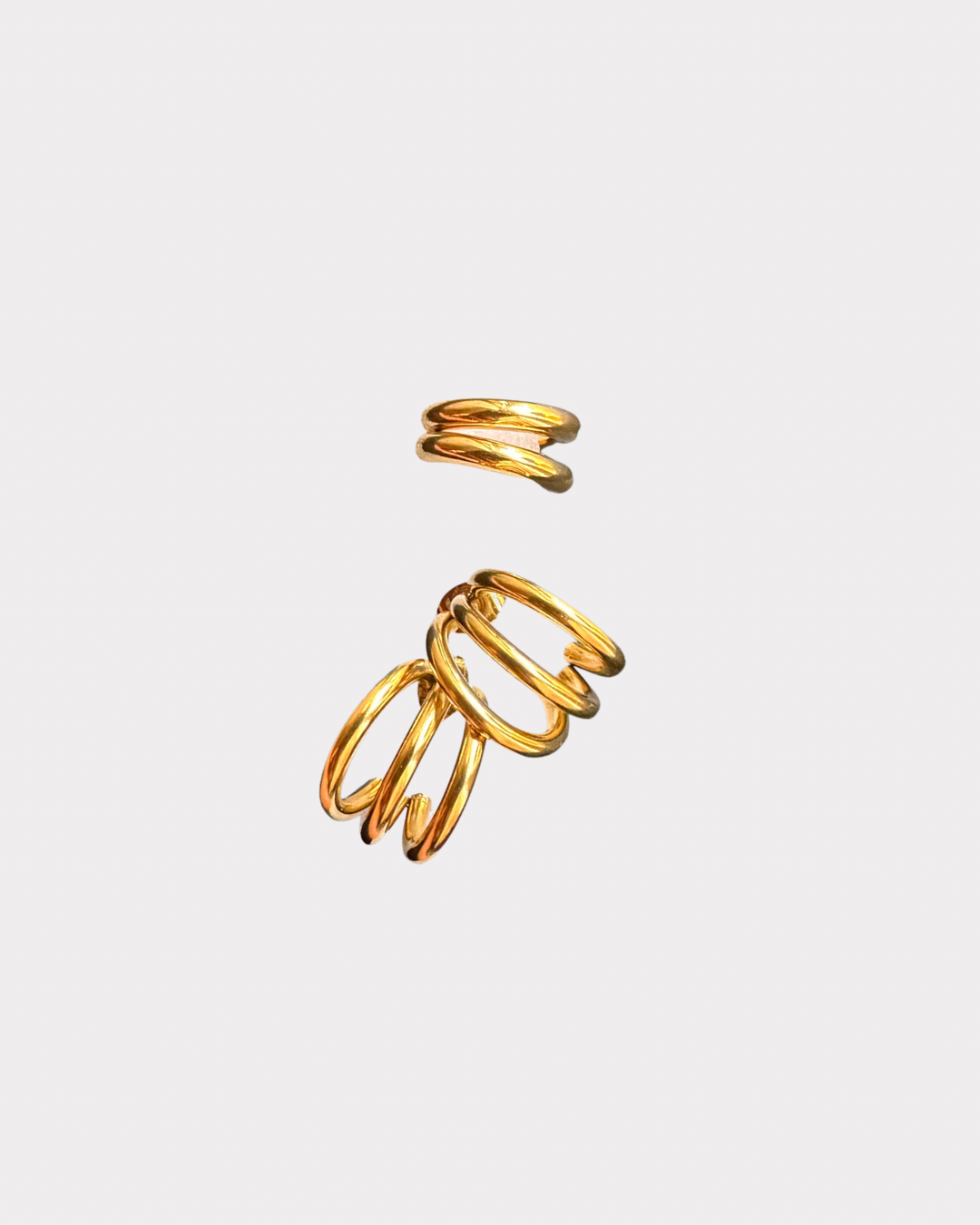 Set composto da un paio di orecchini a bottone dorati in acciaio inossidabile placcato oro a tre raggi e da un earcuff a due raggi in acciaio inox placcato oro.